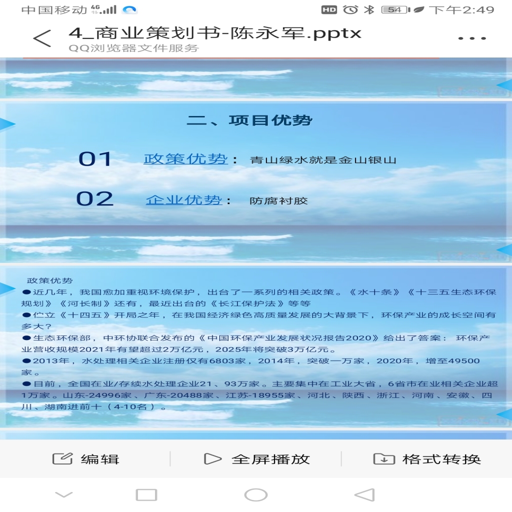 企 业 规 划 书项目名称:水处理设备 设计,生产,加工 设备防腐,衬胶加工策 划 人: 陈永军策划时间:2021 年 3月 日第一部分:项目介绍、项目阐述:水处理设备生产,加工,设备防腐衬胶加工。现全国水处理相关的环保企业达到21、93万家,但有生产加工能力的很少,基本上是空头的对缝的公司,能做防腐衬胶的就更少。近几年,我考察了南方几个省的市场,一共才找到十几家做防腐衬胶的。二、项目优势:1)政策优势:《绿水青山就是金山银山》近几年,我国愈加重视环境保护,出台了一系列的相关政策。《水十条》《十三五生态环保规划》《河长制》还有,最近出台的《长江保护法》等等伫立《十四五》开局之年,在我国经济绿色高质量发展的大背景下,环保产业的成长空间有多大?生态环保部,中环协联合发布的《中国环保产业发展状况报告2020》给出了答案:环保产业营收规模2021年有望超过2万亿元,2025年将突破3万亿元。 2013年,水处理相关企业注册仅有6803家,2014年,突破一万家,2020年,增至49500家。 目前,全国在业/存续水处理企业21、93万家。主要集中在工业大省,6省市在业相关企业超1万家。山东-24996家、广东-20488家、江苏-18955家、河北、陕西、浙江、河南、安徽、四川、湖南进前十(4-10名)。2)企业优势:(防腐衬胶) 我于2000年进入沈阳水处理设备厂(现佳鹤集团总公司,典型的家族企业),沈阳水处理设备厂于1981年建厂,至今已有40多年历史。是东北首家集科研与生产为一体的大型水处理行业领军企业。 2000年我进厂时,沈阳水处理在全国排名第四位(当时全国也就几千家),生产能力和技术在全国很有名气(梁鹤老厂长)。我工作的防腐车间(防腐衬胶),当时,全国也没有几家做的,总厂高薪聘的谢工(70多岁),我们那时,基本工资400元/月,谢工1800元/月。工艺和技术还是很有优势。三、项目介绍:需融资5000万,三年内,把公司做到上市。1)沈阳厂区扩建,需融资1000万,第一年,融资100万, 出让股权10%。第2-3年,融资900万。2)南方(宜兴)新建(先租后买)厂区,需融资4000万,第一年,融资200万,出让股权5%。第2-3年,融资3800万。企业目标:三年,年产值超亿元大关。 第一年:每个厂产值达到千万元。 第二年:沈阳达2千万,南方达3千万。 第三年:沈阳达3千万,南方产值达7千万。3-5年,把企业发展成为上市公司。3)人员以老厂的这些老人为基础,设计预算/生产加工/安装调试。在沈阳厂区这边为培养后辈人才,为南方厂区输出。4)投资预算:沈阳厂区预计投资200万,基础建设100万。南方厂区预计投资300万,基础建设200万。5)投资回报:1-2年回本,股权保留。三年内企业向集团化发展,以利于上市要求。投资预算:沈阳厂区,厂房1000平,行吊下8米。场地5000-1000平,租金20万。新建除尘车间,除尘设备(布袋除尘器)新建负压车间,(硫化车间)上脱硫设备。共需50万做环评8万,新进加工设备-工具,需12万,硫化罐先借用。合计:租金20万 车间50万 环评8万 工具12万 合计:90万(100万备用)南方厂区,厂房1000-3000平,吊下8米。场地10000平,租金30万。新建除尘车间,除尘设备。新建负压车间,脱硫设备。需80万。做环评10万,新进加工设备-工具15万。新进硫化罐,预计50万(直径5米,长18米)合计:租金30万 车间50万 环评10万 工具15万 硫化罐50万 合计150万(200万备用)生产预算:衬胶-胶板比重1点5公斤/平。1个厚胶板-1点5公斤/平,2个厚胶板-3公斤/平,3个厚胶板-4点5公斤/平。一层胶板加工费300元/平,2000斤除9斤=222平,一吨3个厚胶板222平。加工一吨毛利:222*300=66600元。两层胶板加工费500元/平,2000斤除15斤=133平。两层胶板能加工133平。(一层3厚,一层2厚)。两层胶板一吨加工费133乘500=66500元。胶板18000元/吨,一工一料36000元/吨。利润:66600-36000=30600元。
