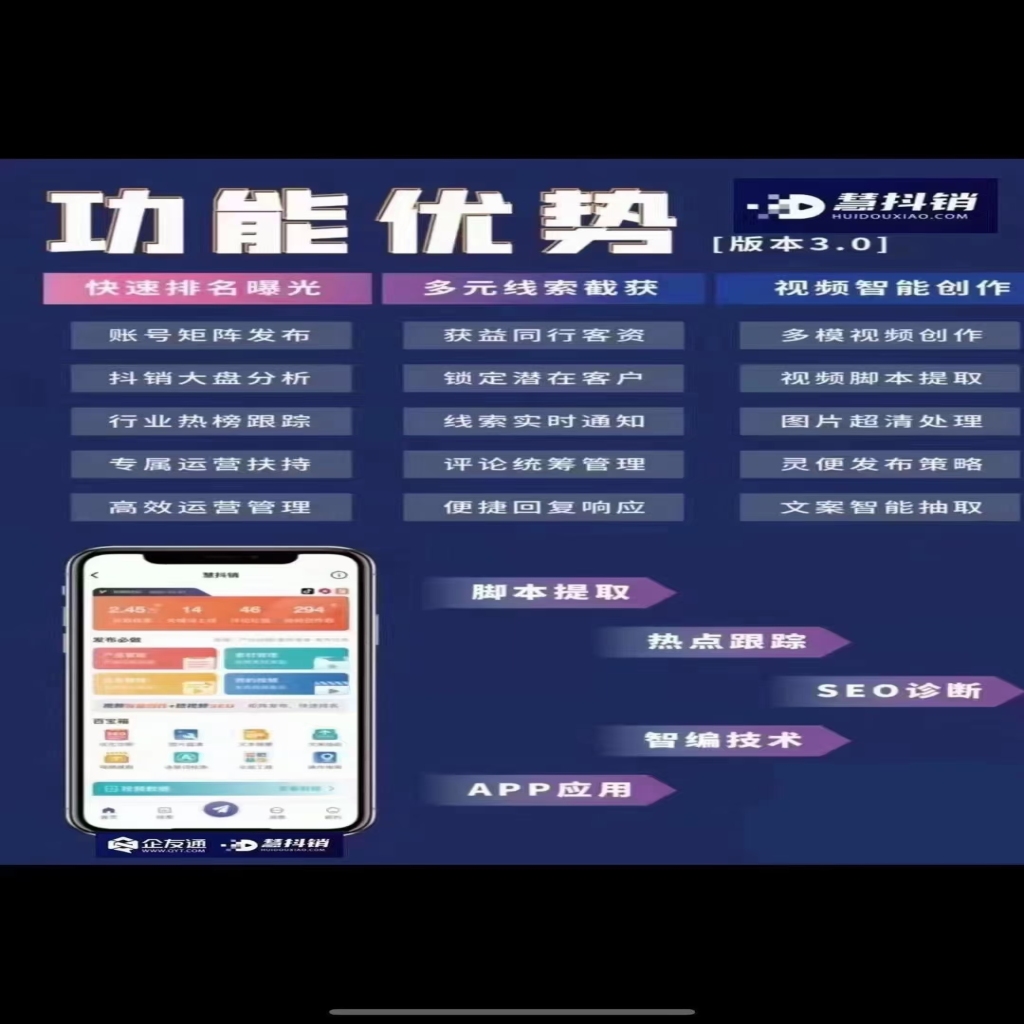 产品慧抖销,是基于抖音快手等短视频平台,帮助客户一键管理抖音等账号,自带生成发布视频,自动优化搜索排名,自动抓取线索与私信,提升用户在抖音等平台的展示量,获取搜索排名获得潜在客户。